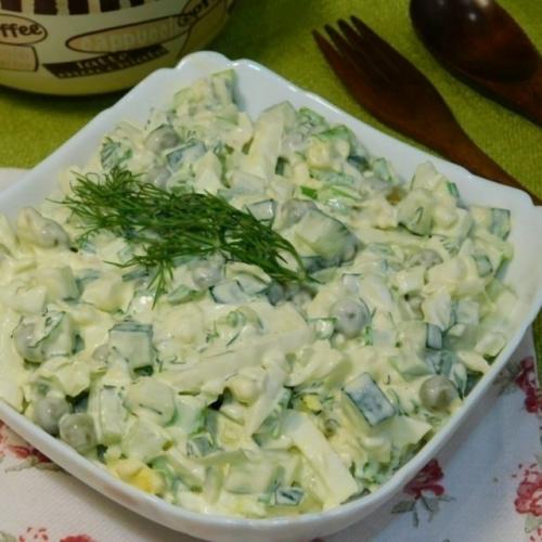 1. яйца отварите и нарежьте. Добавьте к ним консервированный зеленый горошек.