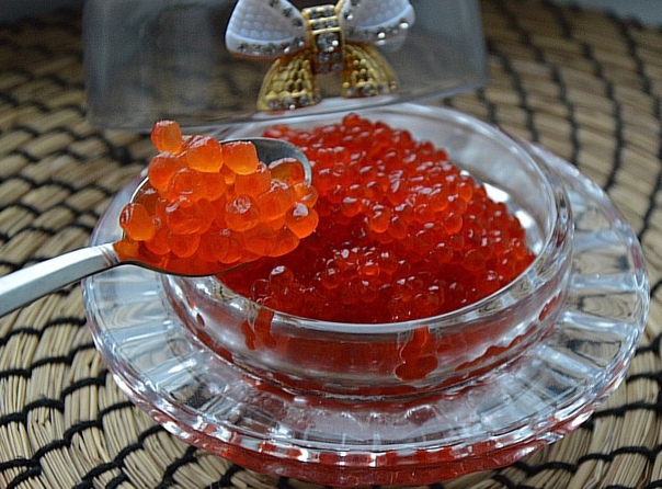 - Икра Чавычи – подобный вид характеризуется ярким окрасом янтарного или красного цвета. Имеет нежный вкус и довольно крупный диаметр икринок около 6 мм.